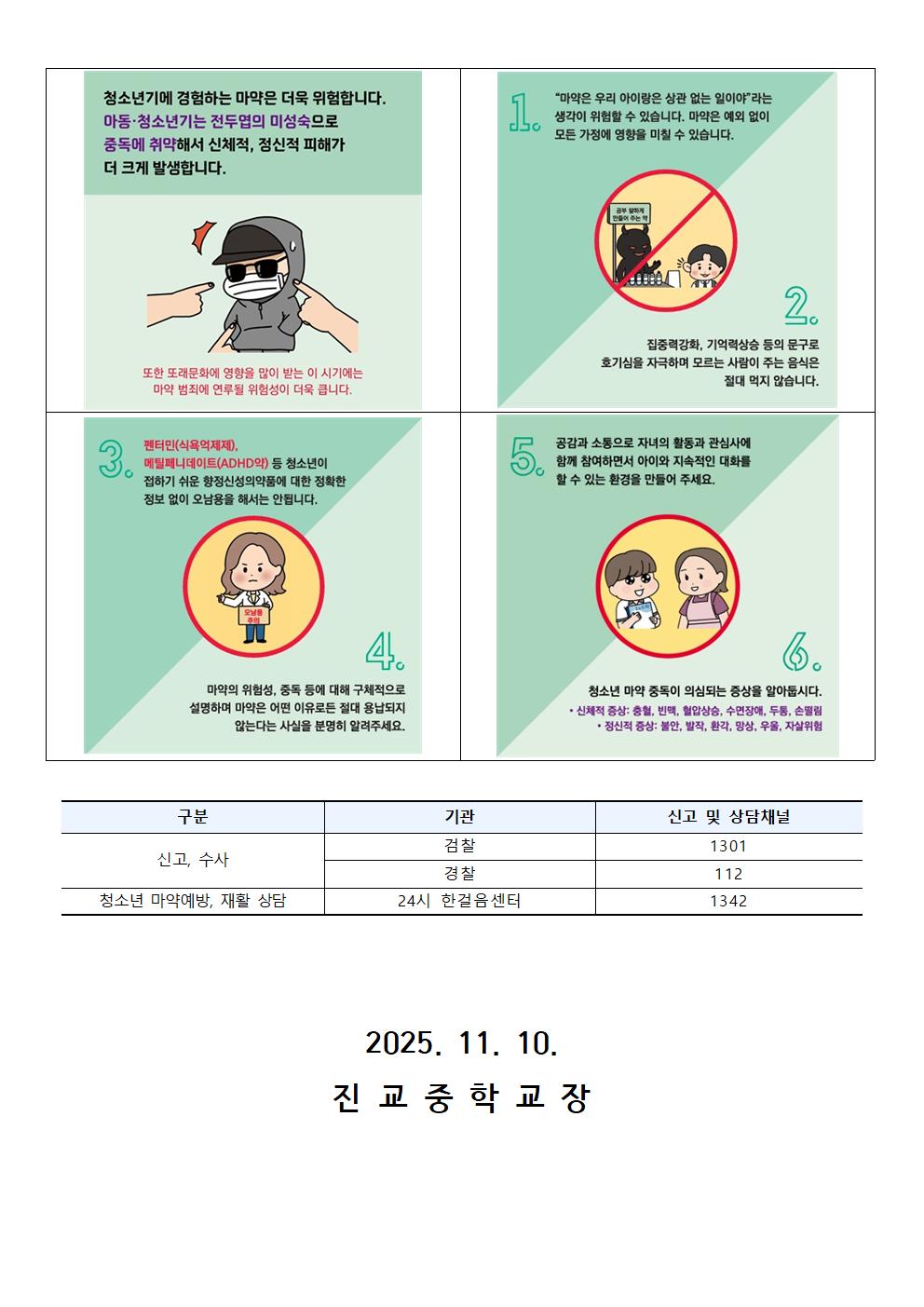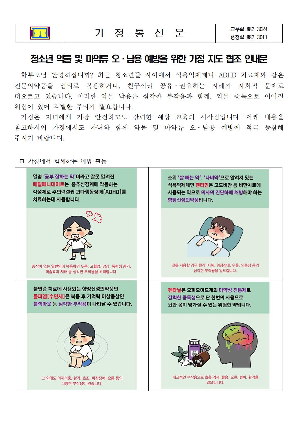 청소년 약물 및 마약류 오 남용 예방을 위한 가정 지도 협조 안내문