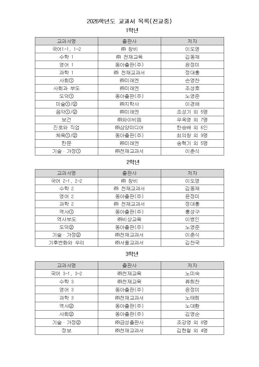 2026학년도 교과서 출판사 안내